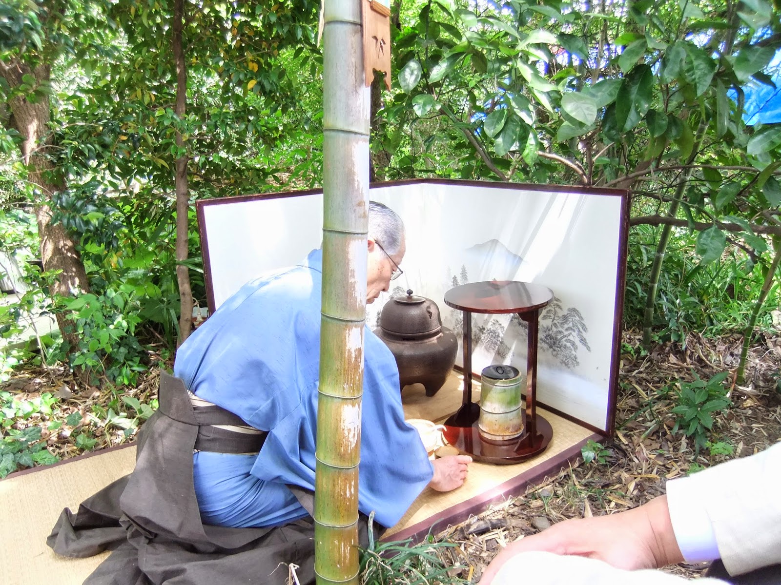 Impreza „- W- Bambusowym zagajniku ” 竹林 茶会” – okazala sie rodzajem unikalnej kolaboracji : japonskie CHANOYU szkoly Omotesenke plus chinsko-tajwanska sztuka herbaty przygotwana przez mistrzynie. W prywatnym ogrodzie -( troche zaniedbanym jak na japonskie standarty )- odbyla sie cicha degustacja herbaty , podziwianie naczyn -czyli uczta dla oka, nauka o herbacie ale przede wszystkim wpaniale spedzony czas dajacy wyciszenie ,relaks oraz satysfakcje. To ze herbate byla popijana pod bambusami – zrobilo fantastyczny klimat.( Wydaje mi sie ze w polskich warunkach takie spotkanie swietnie wypadlo by pod sosnami.)