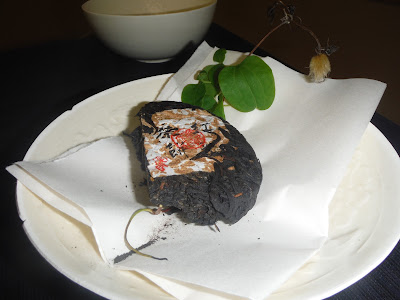 Prezentancja ciastka herbaty pu-erh – widzimy jak gospodarz stara się aby każdy etap spotkania był dopracowany i żeby zadowalal zaproszonych gości .