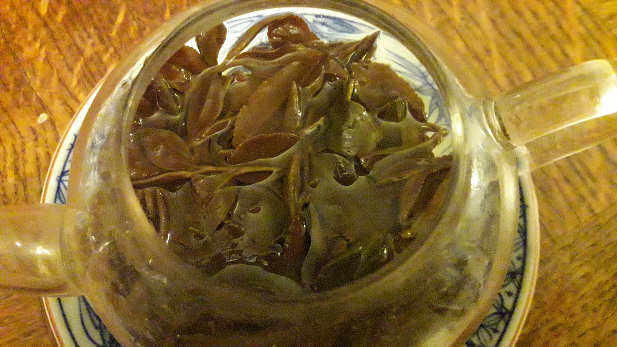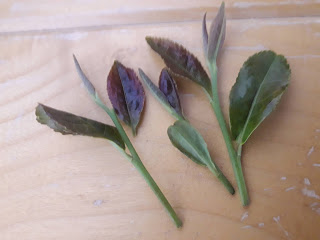 Jak widać na fotografii są to młode listki dodatkowo przebarwione na kolor purpurowy. Co to za herbata ? Zbierana sierpniu czyli jest to typ bancha – i to by się zgadzało jeśli chodzi o walory smakowe – letnie listki nie maja tyle „energii i mocy „ co wiosenne pierwszoroczne.