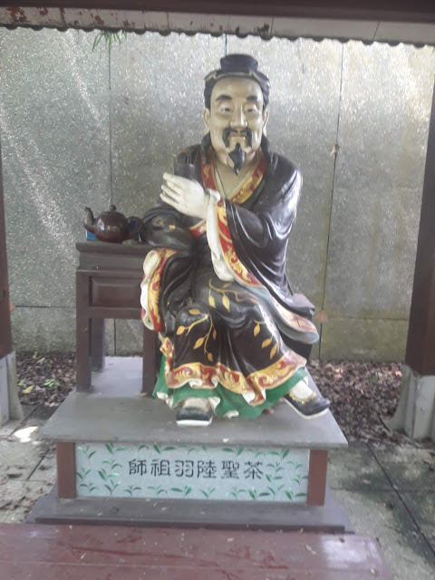 W połowie drogi na szczyt znajdziemy altanę w której postawiono figurę Lu Yu – autora pierwszej rozprazwy o o herbacie czyli Cha Jing ( 茶経 ). Aby było ciekawiej Lu Yu popija napar z czajnika choć za jego czasow totalnie inaczej przygotowywano herbatę.
